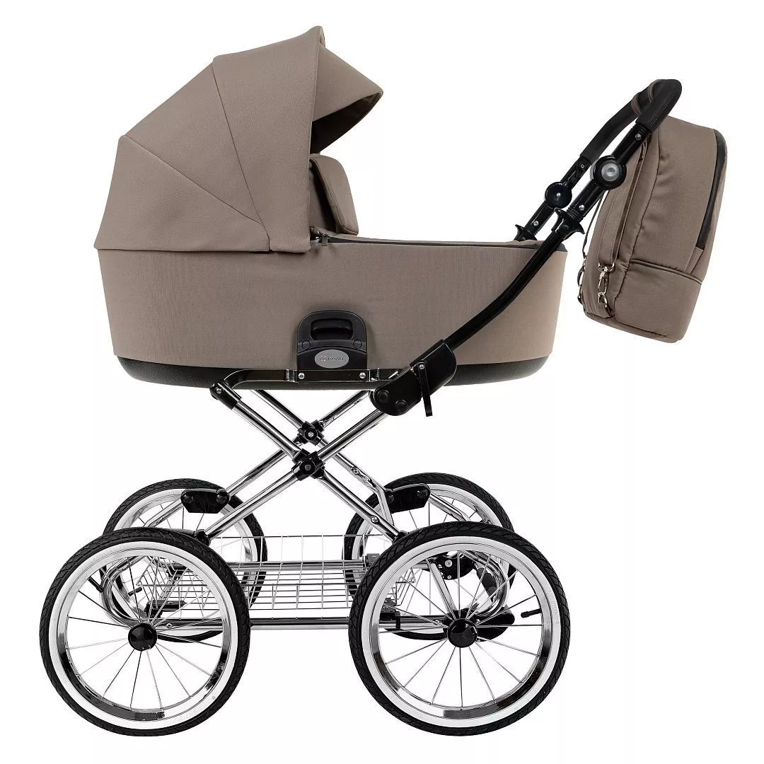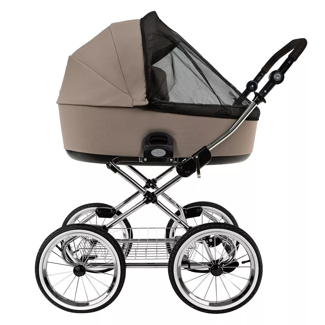 Ручка регулируется по высоте — девять положений от 72 до 108 см. Подстраивается под рост от 160 до 195 см. Корзина металлическая сетчатая — не провисает под весом, выдерживает большую нагрузку. Доступ с любой стороны. В комплекте: сумка для мамы, дождевик, москитная сетка, плед.