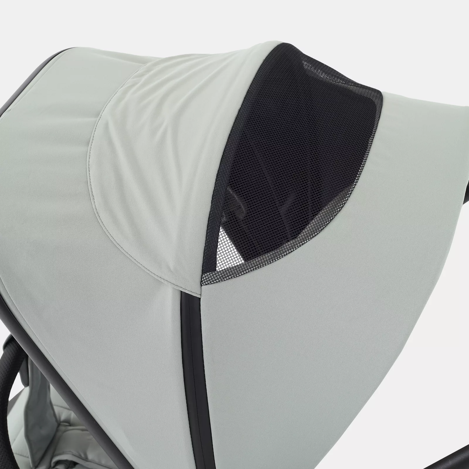 Удерживает тепло в холод и не перегревается летом. Литая конструкция лёгкая и прочная. Капюшон с вентиляцией и большим козырьком, бесшумный — не разбудит ребёнка.