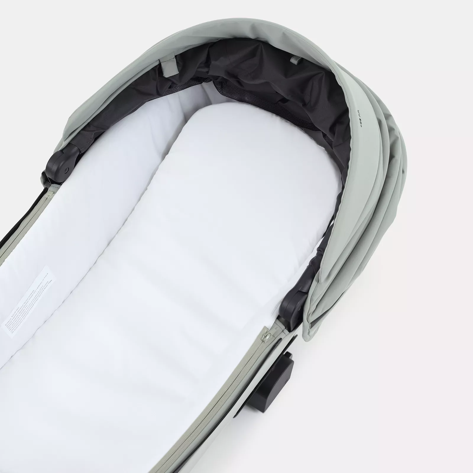 Внутри: хлопковый чехол на молнии, матрас средней жёсткости и поднимающаяся спинка. Тёплая накидка крепится на молнию с двойным ходом — удобно отстёгивать с любой стороны. Отворот с окошком защитит от ветра.