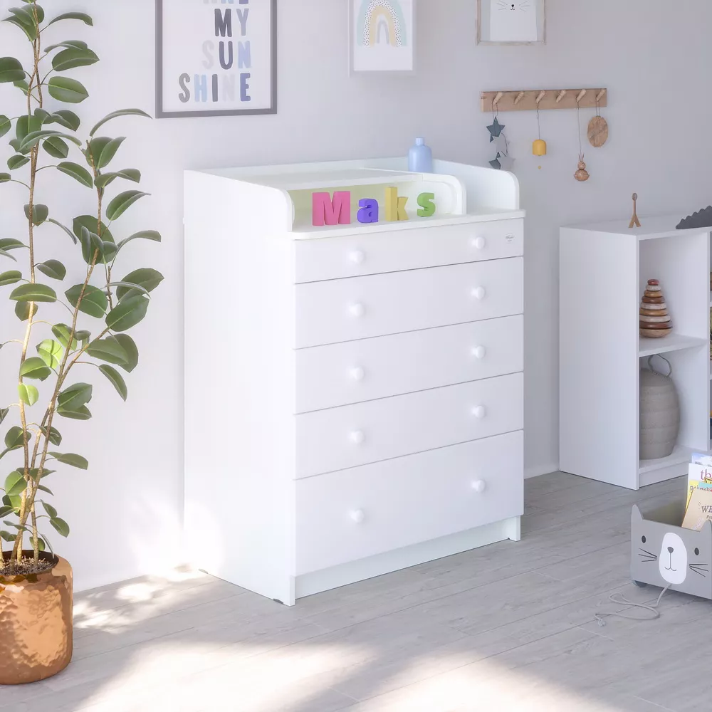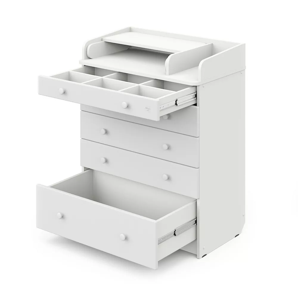 Комод очень вместительный благодаря пяти ящикам, которые установлены на надежные шариковые направляющие бесшумного хода. Нижний ящик большей глубины, а верхний с органайзером для удобства сортировки детских вещей (6 отделений). Глубина ящиков сверху вниз: 8,5 см, 10 см, 10 см, 10 см, 18,7 см.