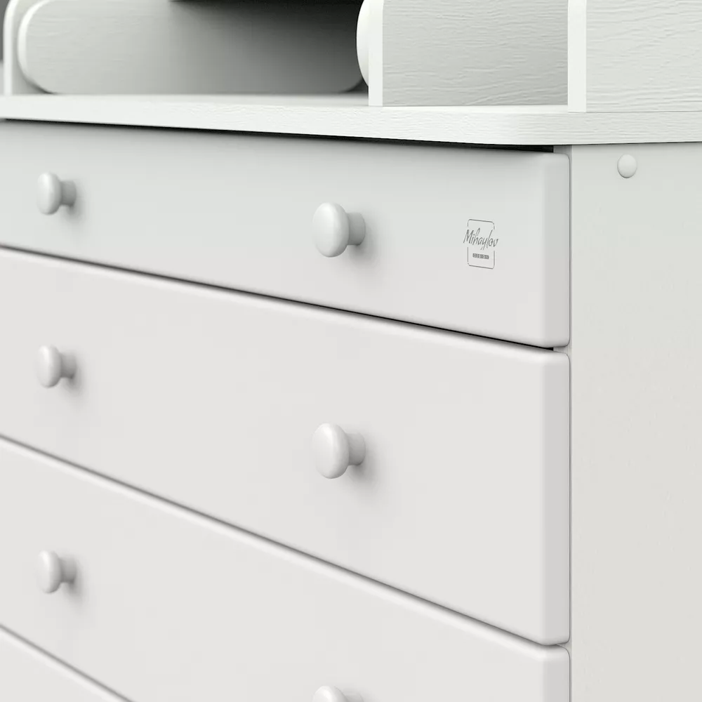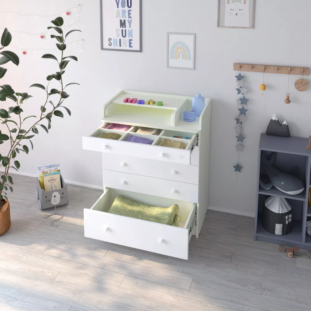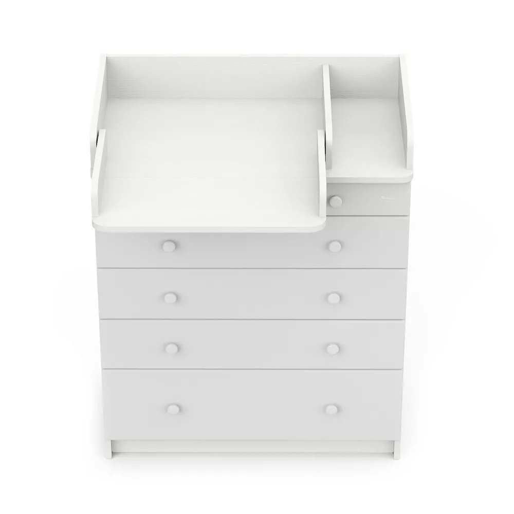 В комоде используется пеленальный столик с простым и надежным, скрытым механизмом раскладывания. Есть отделение рядом с пеленальным столиком для средств по уходу за малышом в быстром доступе.