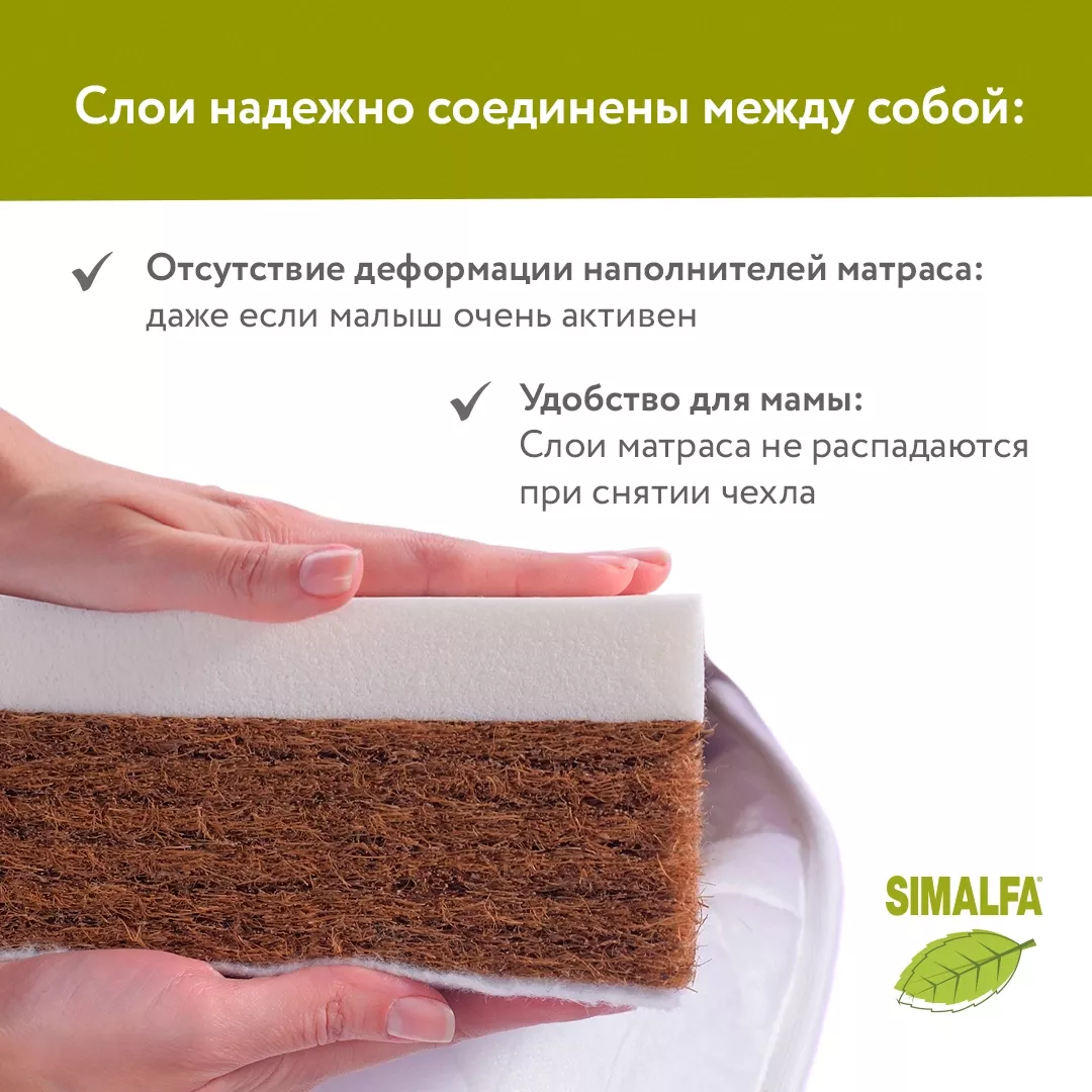 Для удобства слои матраса скреплены между собой. Важно: слои скреплены специальным экологичным составом Simalfa (производство Швейцария). Состав на водной основе, без запаха, безопасен для ребенка и имеет сертификат качества. Т