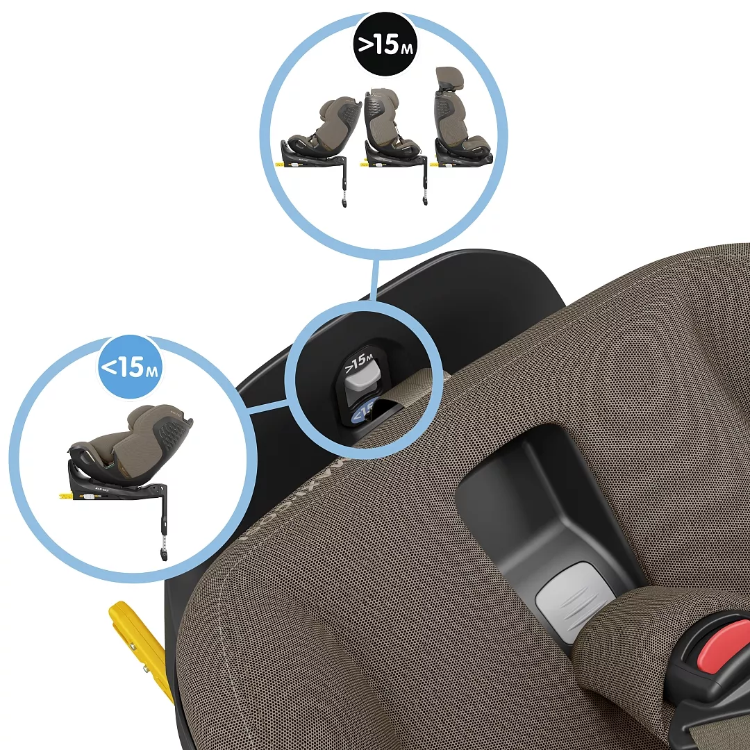 Этап 2: Малыш (75-105 см, 1-4 года). Положение против хода движения (рекомендуется) или по ходу (с 15 месяцев), крепление ребёнка 5-точечными ремнями, установка ISOFIX + опора в пол. Вставка снимается, регулируемый наклон спинки для комфорта. Maxi-Cosi рекомендует продолжать перевозить ребёнка спиной вперёд как можно дольше (в идеале до 4 лет), так как это значительно безопаснее при фронтальных столкновениях.
