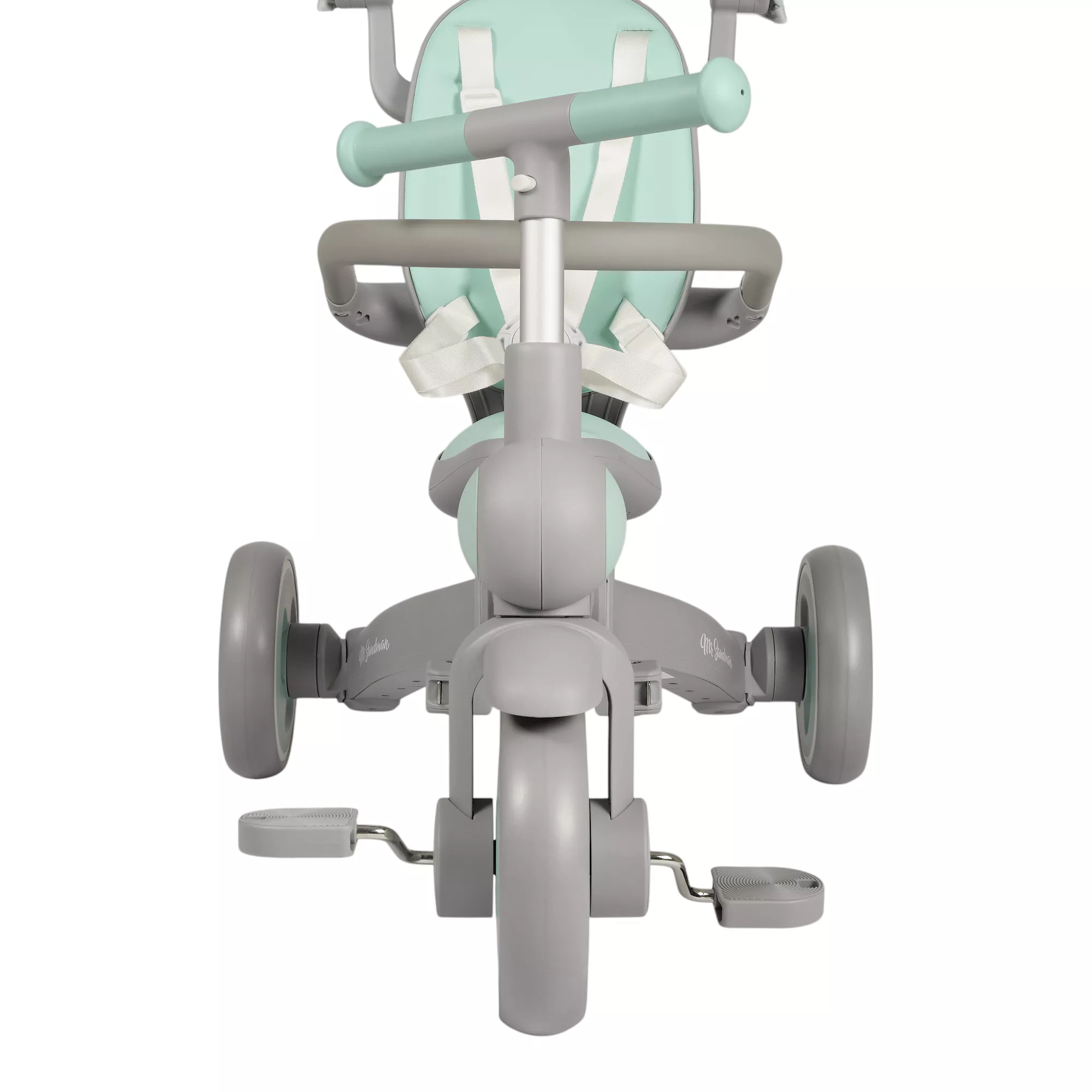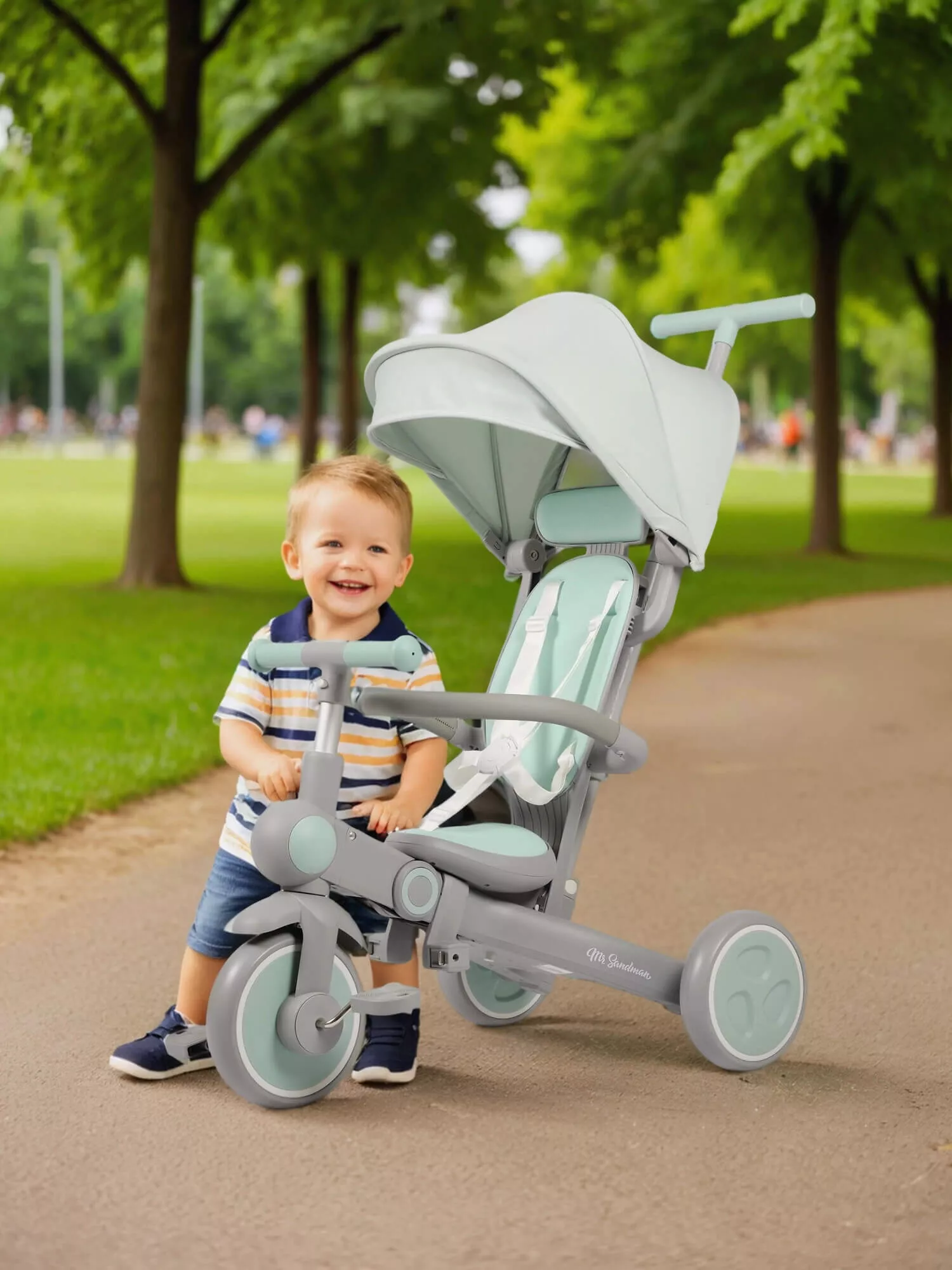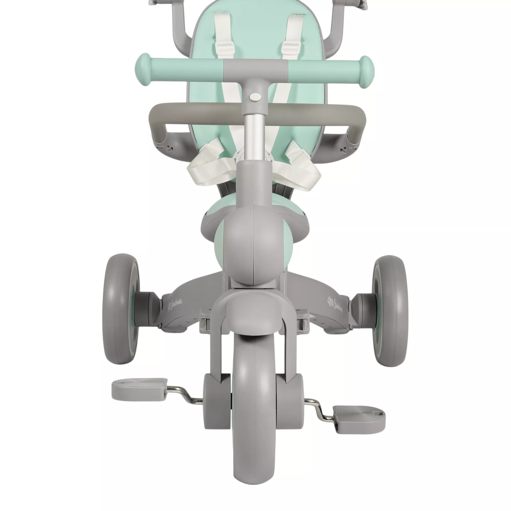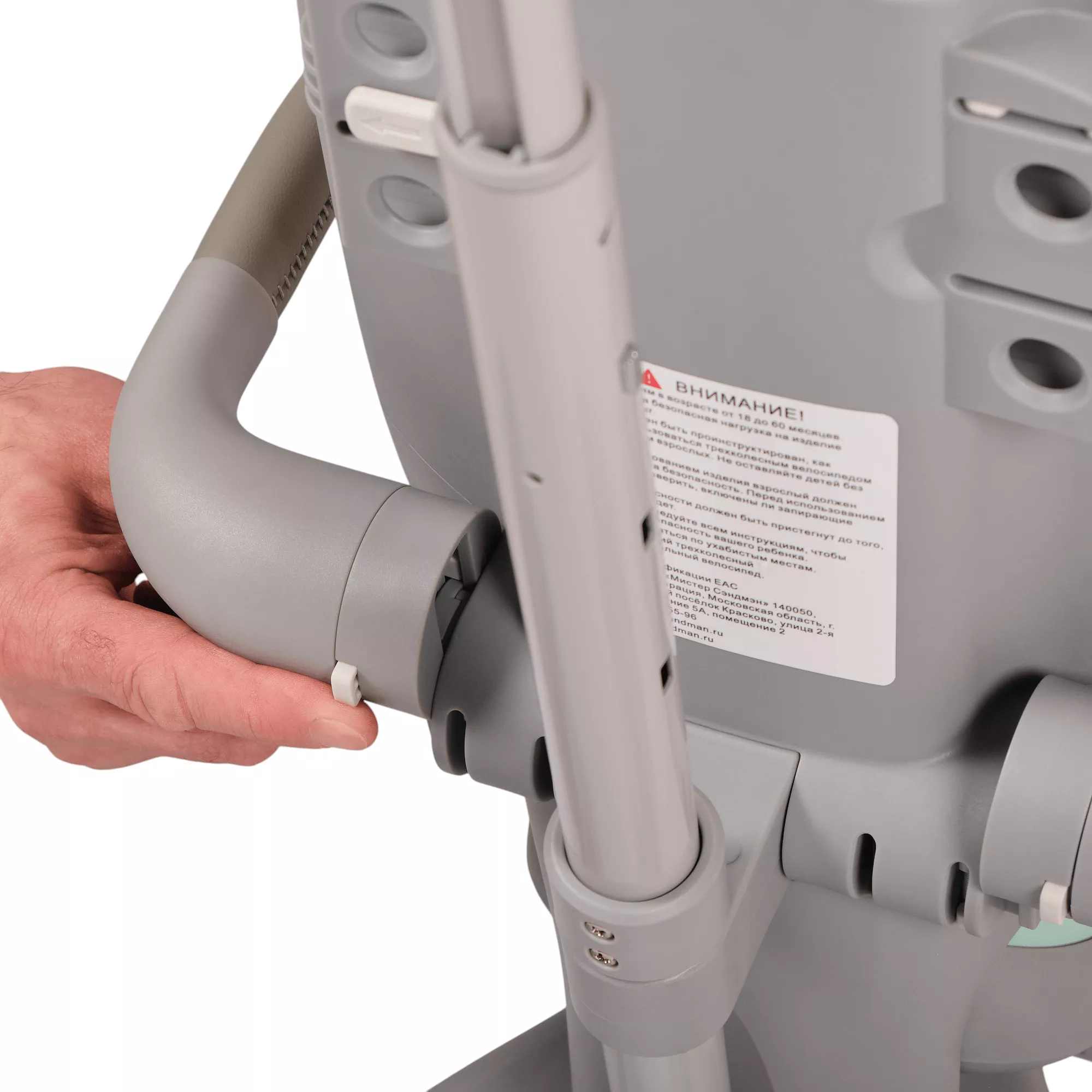 Все детали велосипеда снимаются: родительская ручка, капюшон от солнца, бампер, педали, спинка. Седло и спинка очень удобные и мягкие. Благодаря съемным переустанавливаем педалям, получаем удобную подставку под ноги для самых маленьких.Многофункциональный велосипед трансформер имеет 4 варианта конфигурации в зависимости от потребностей ребенка.