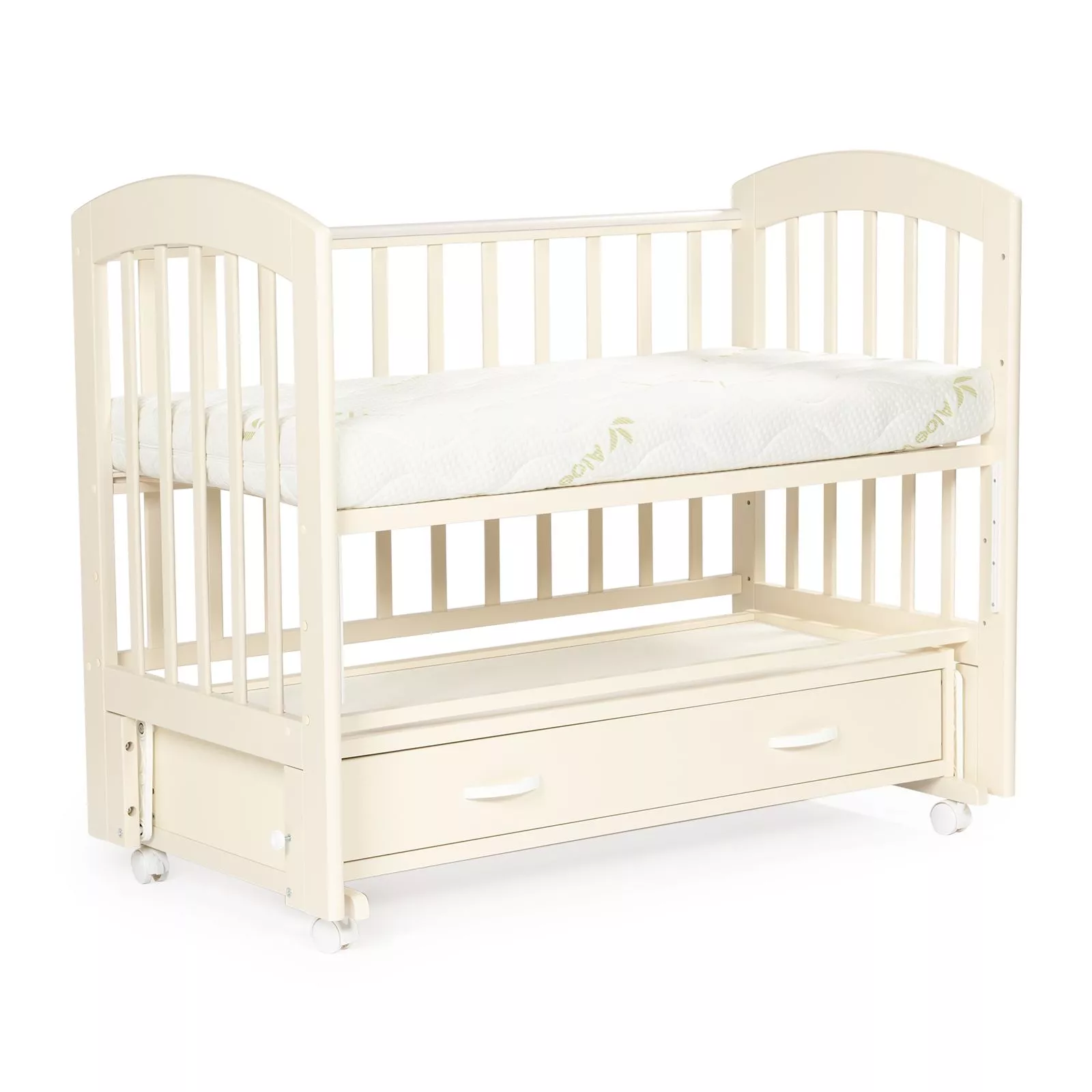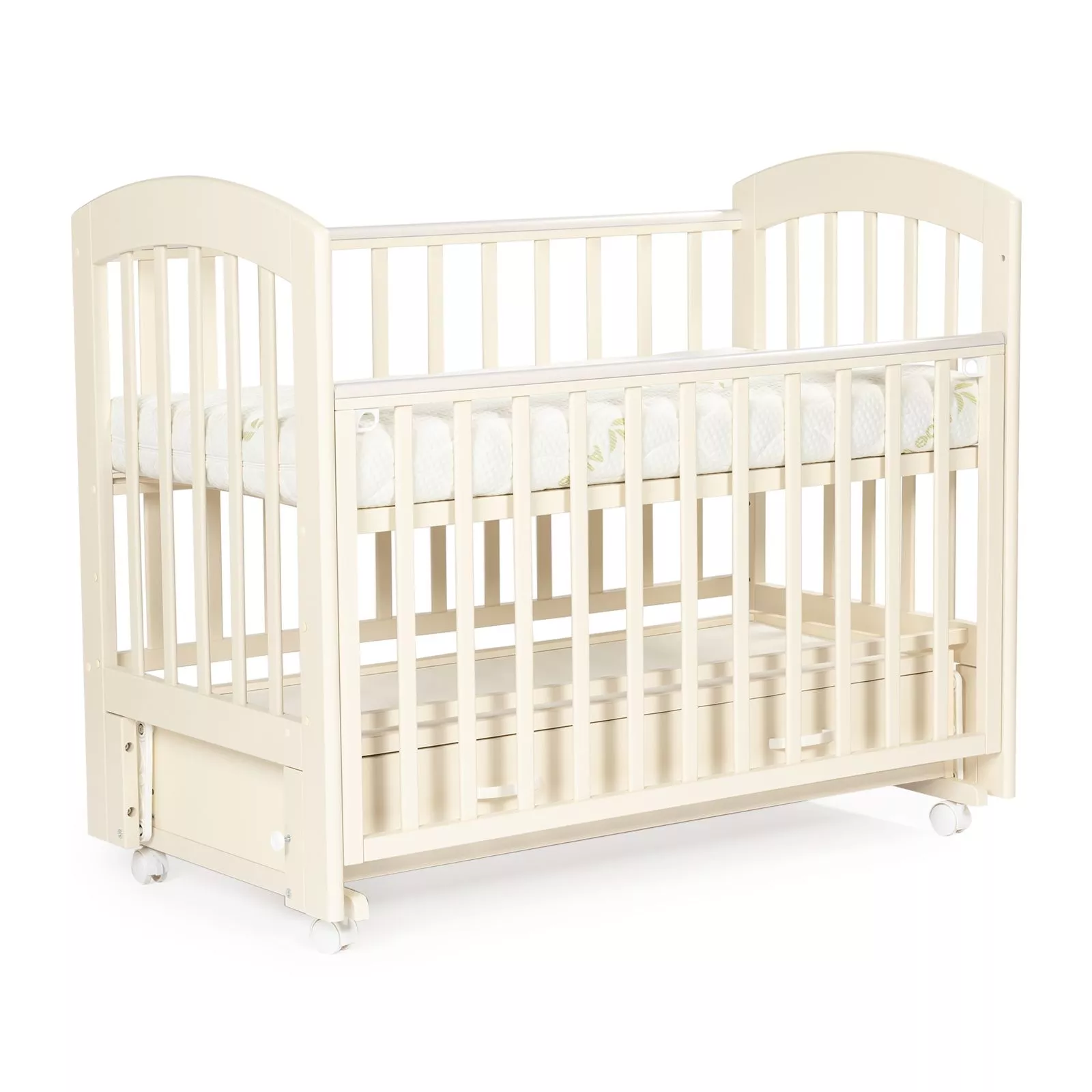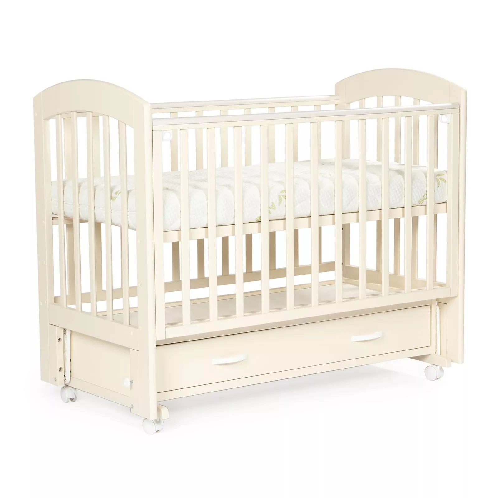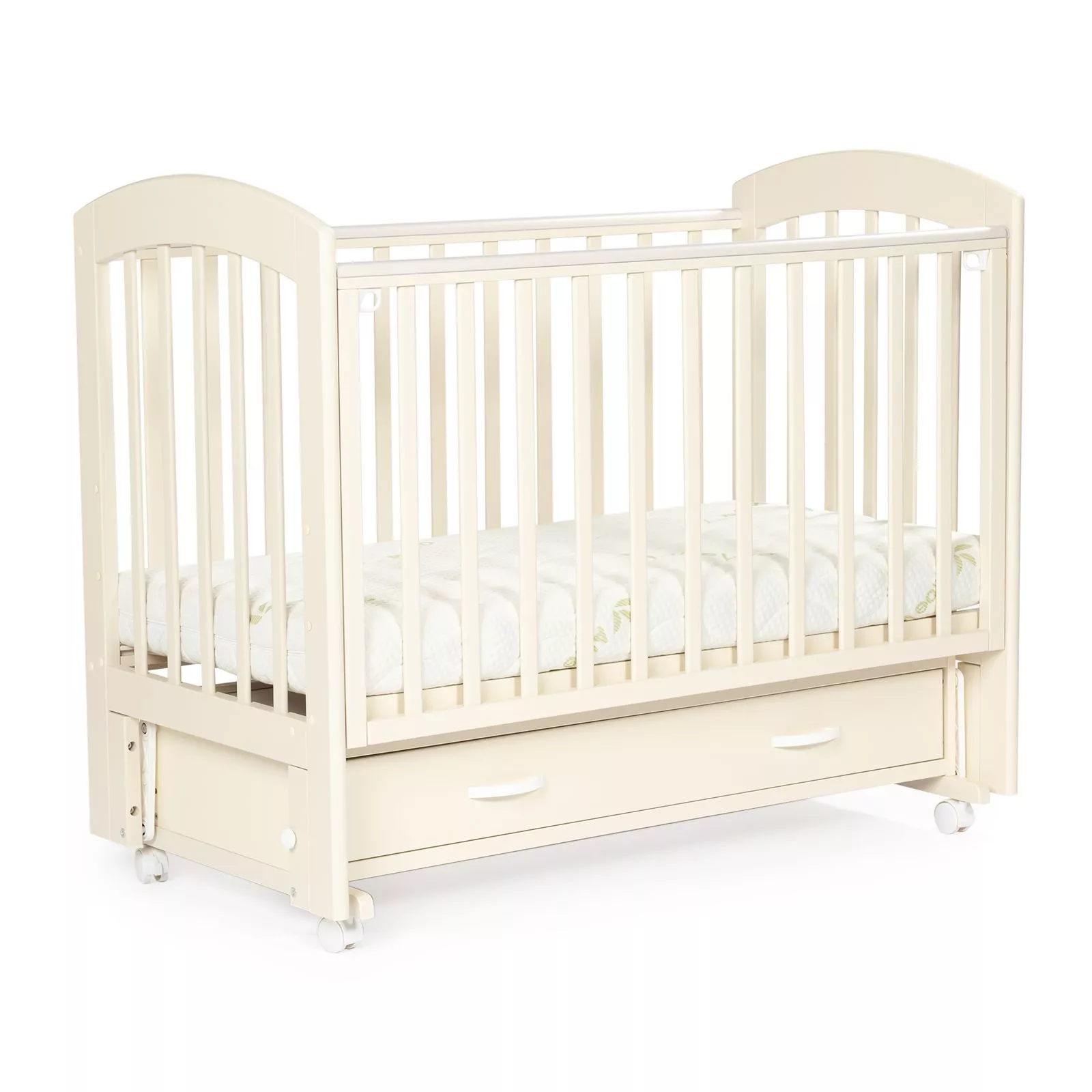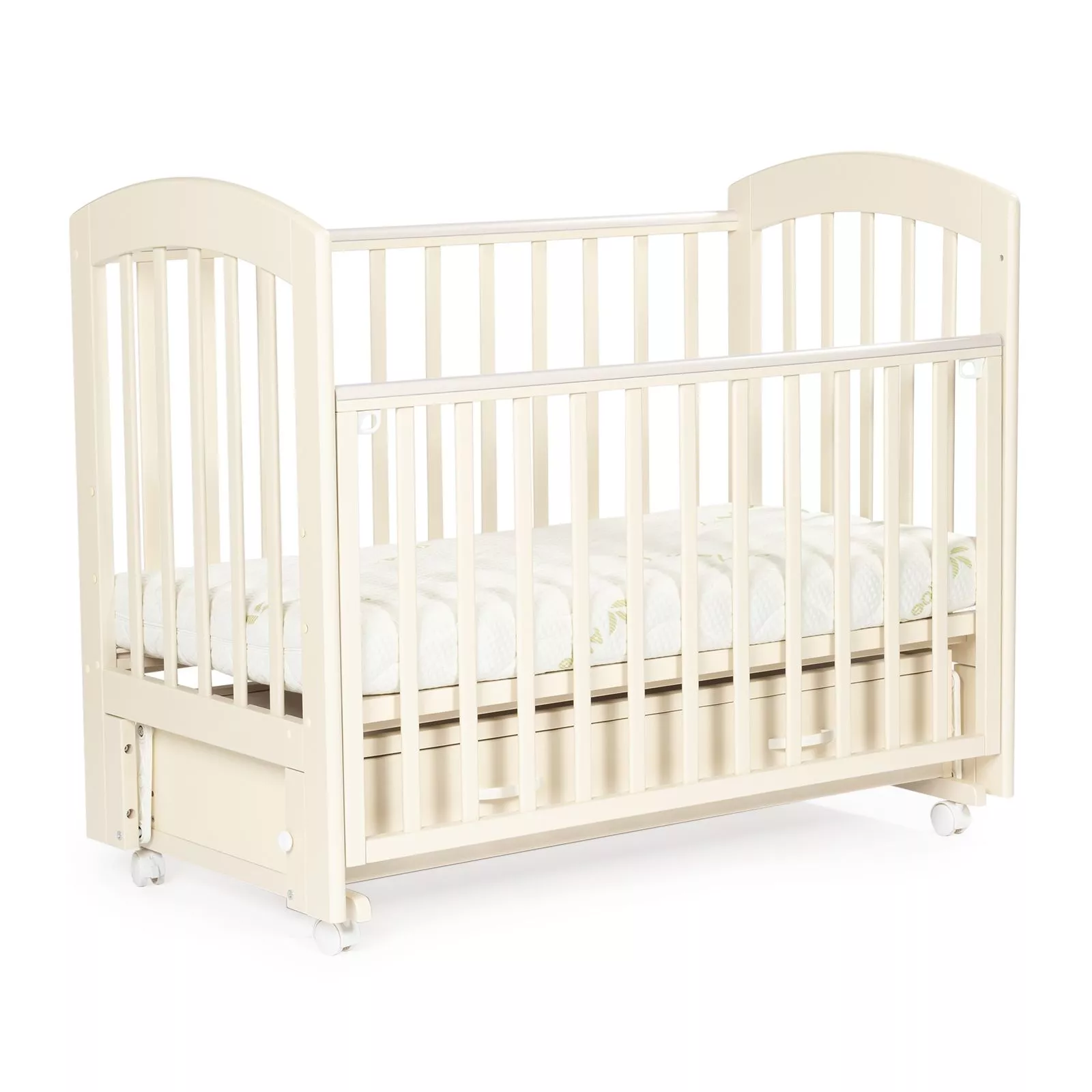 BEBIZARO REGENCY — функциональная кроватка с универсальным маятником и вместительным ящиком для хранения. Прочный каркас из массива берёзы, опускаемая боковая стенка и три уровня ложа делают уход за ребёнком проще, а сон — спокойнее. Ящик помогает держать под рукой бельё, пледы и аксессуары, освобождая место в комнате.