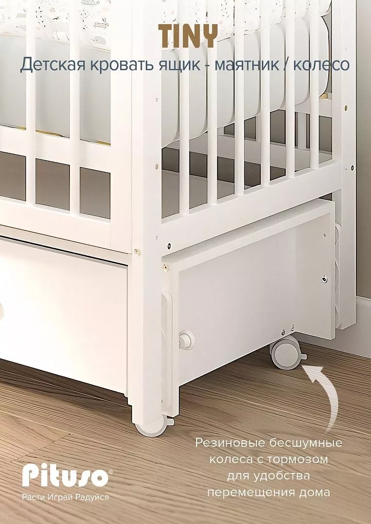 4 резиновых колеса с индивидуальными тормозами на каждом обеспечивают лёгкое перемещение кроватки без шума и царапин на полу. Надёжная фиксация в нужном положении.