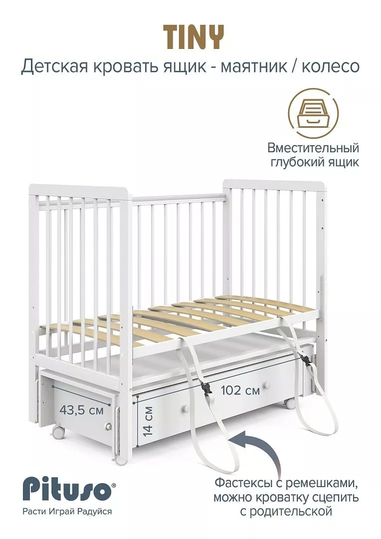 Просторный ящик (высота 14 см, ширина 102 см, глубина 43,5 см) для хранения постельного белья, одежды, подгузников и игрушек. Экономит место в комнате и держит всё необходимое под рукой.
