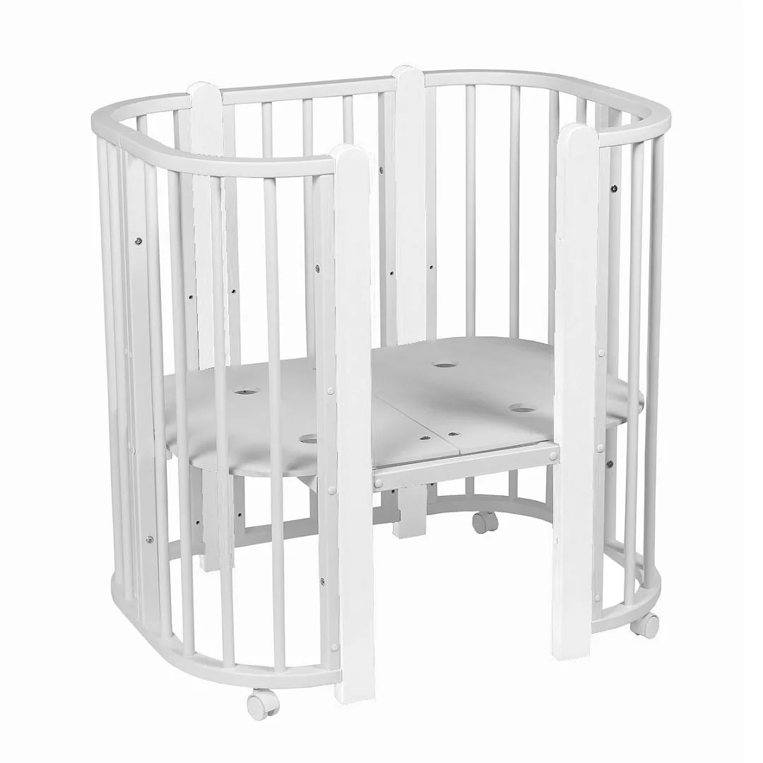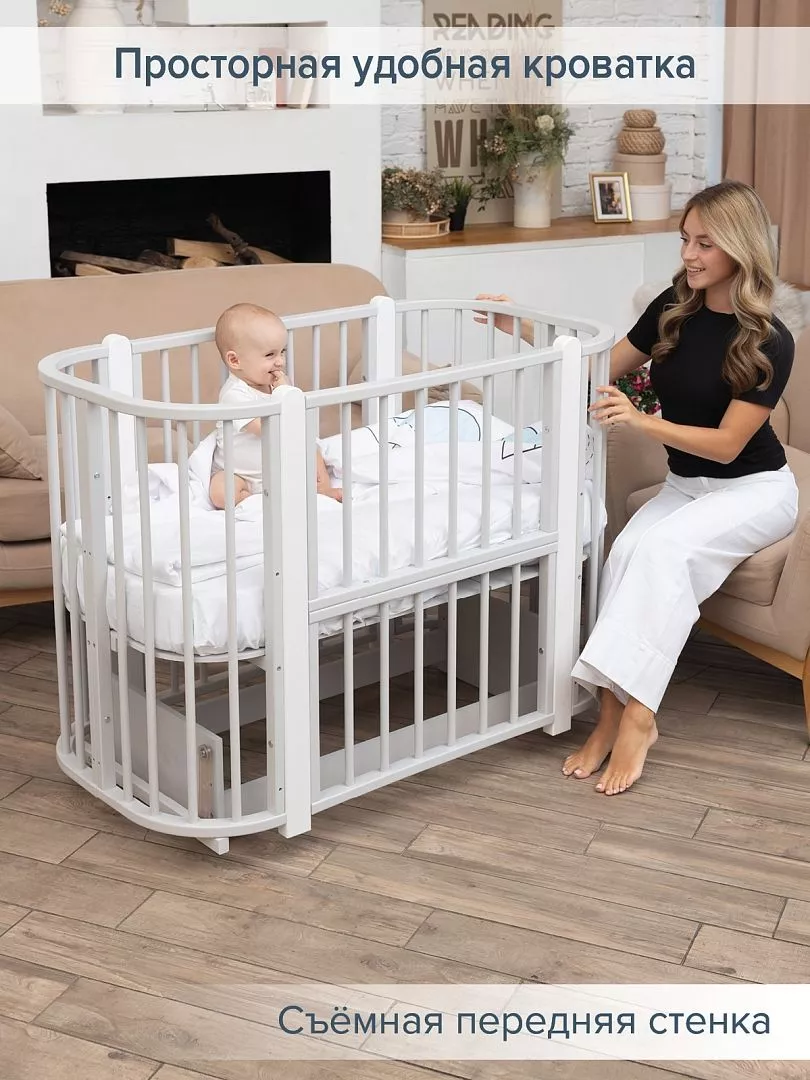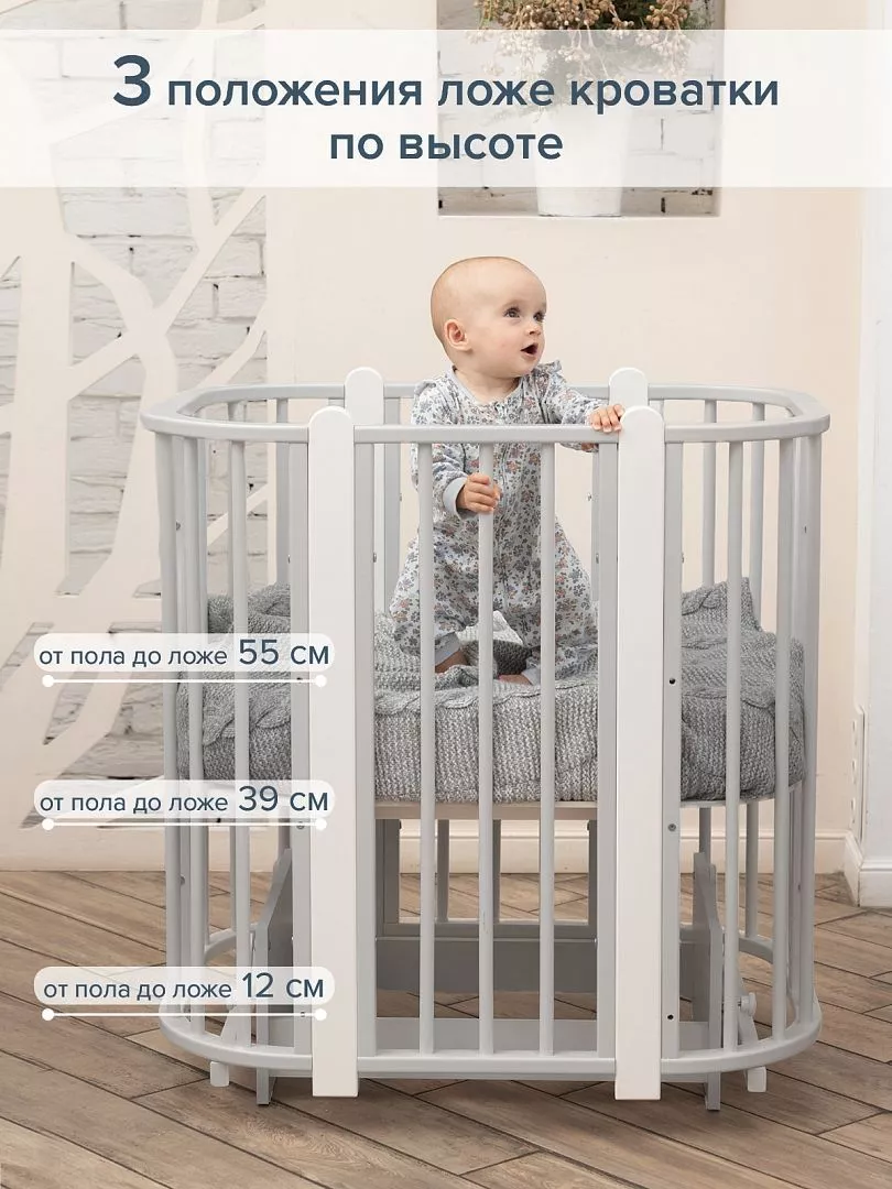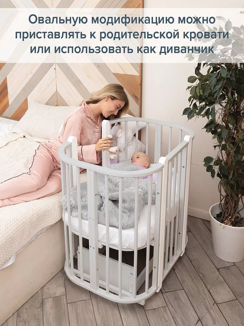 Приставная колыбель для новорождённых, овальная кроватка на маятнике, на колёсах, манеж для игр и диванчик для дневного отдыха. Одна покупка служит от рождения до 3 лет, проходя все важные этапы развития.