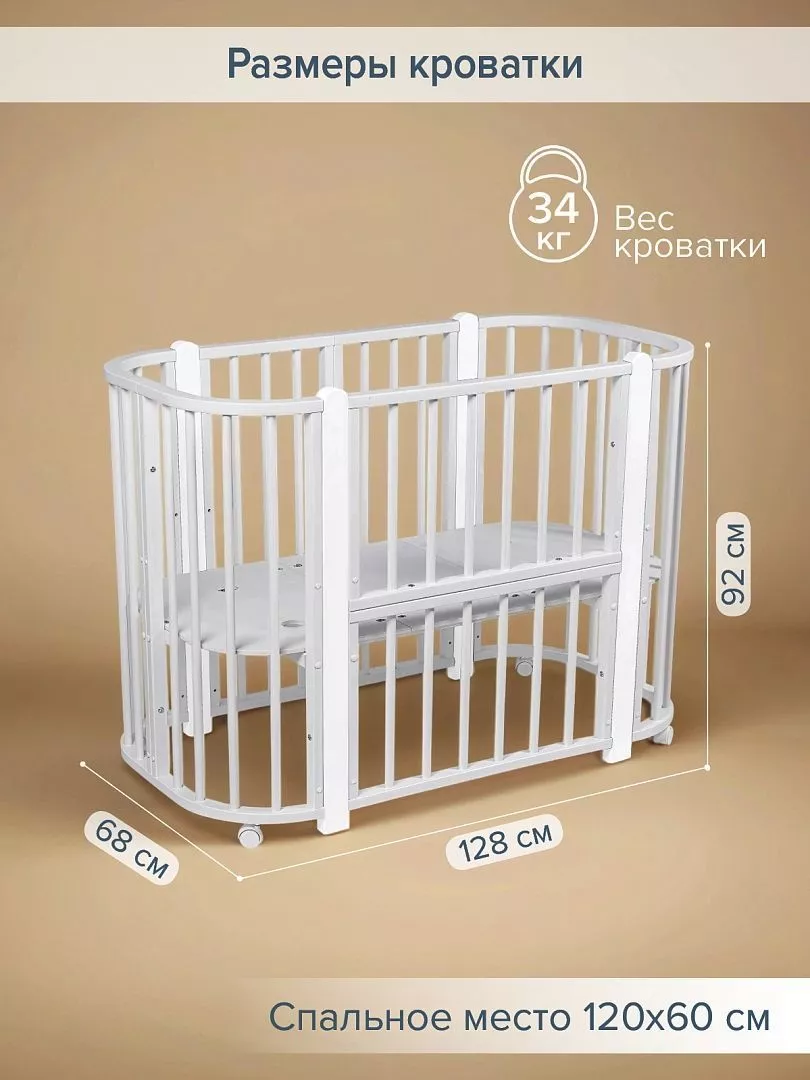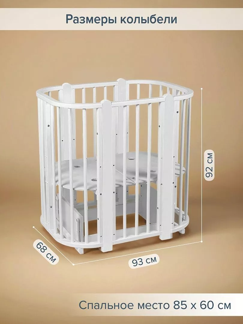 - Размер спального места: 68×60 см (колыбель), 120×60 см (овальная кровать)