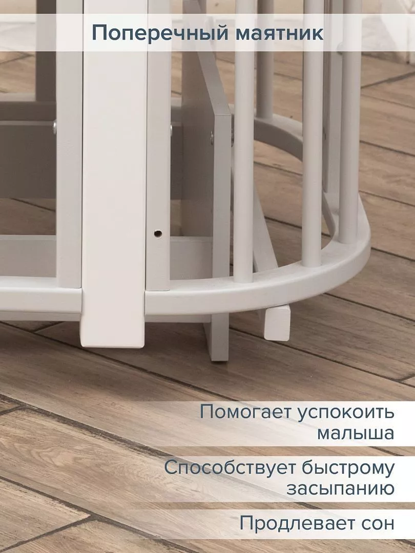 Качание из стороны в сторону имитирует естественное укачивание на руках, помогает быстро успокоить малыша перед сном. Удобно укачивать, находясь сбоку от кроватки. При необходимости легко фиксируется.