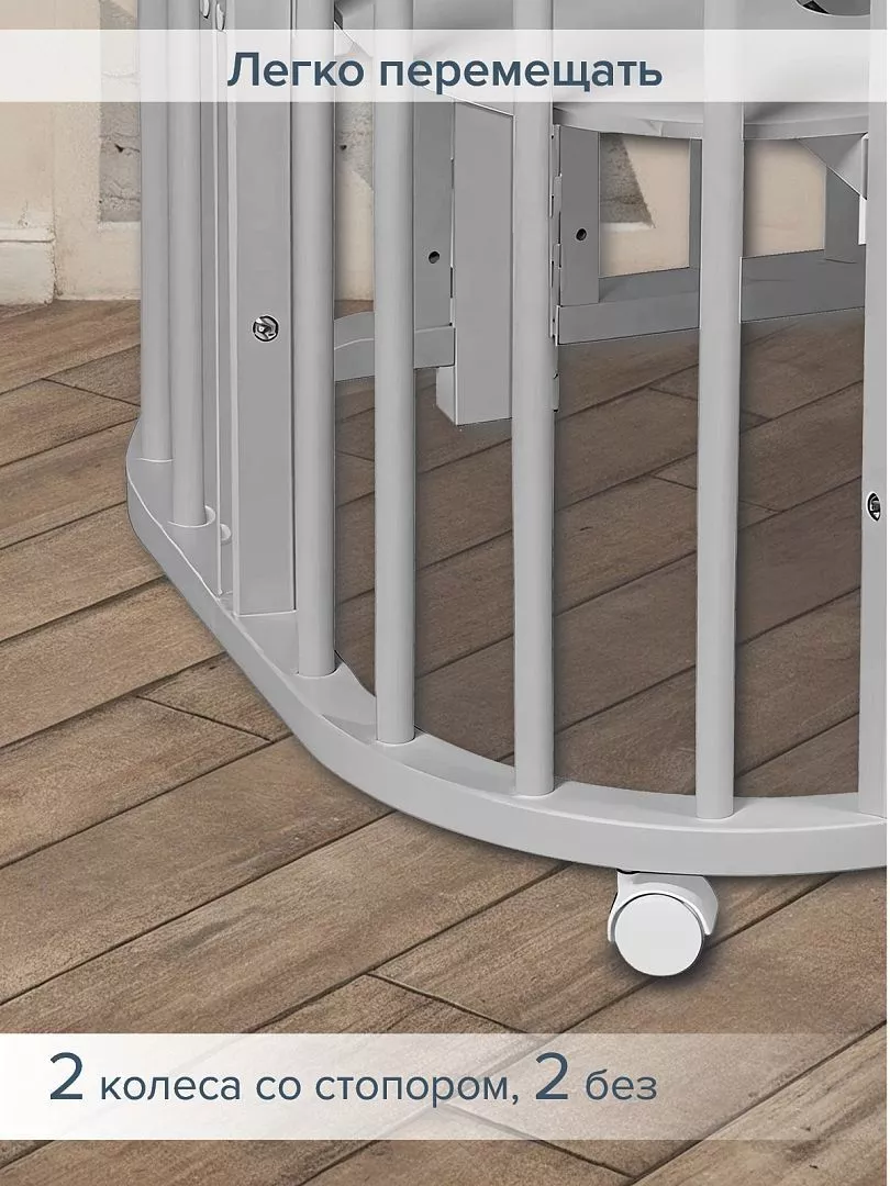 Проходит в стандартный дверной проём, легко перемещается между комнатами. Колёса в комплекте обеспечивают лёгкое перемещение без усилий — можно придвинуть к окну, к родительской кровати или откатить для уборки.